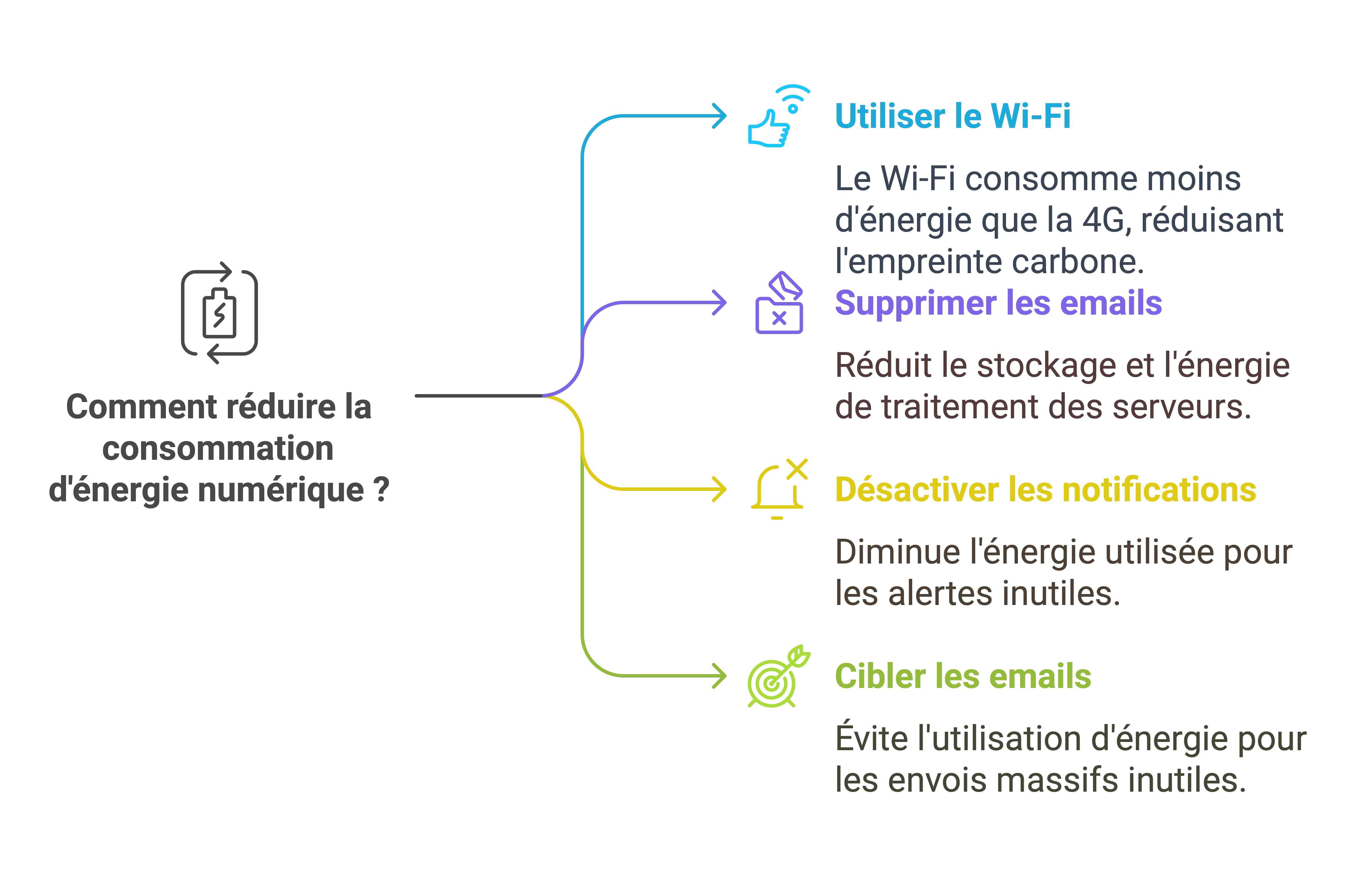 Plusieurs actions sont possibles : compresser les pièces jointes, utiliser des outils de partage de fichiers, privilégier le Wi-Fi à la 4G, nettoyer régulièrement sa boîte mail, cibler précisément les destinataires, et utiliser des plateformes collaboratives pour la communication interne.