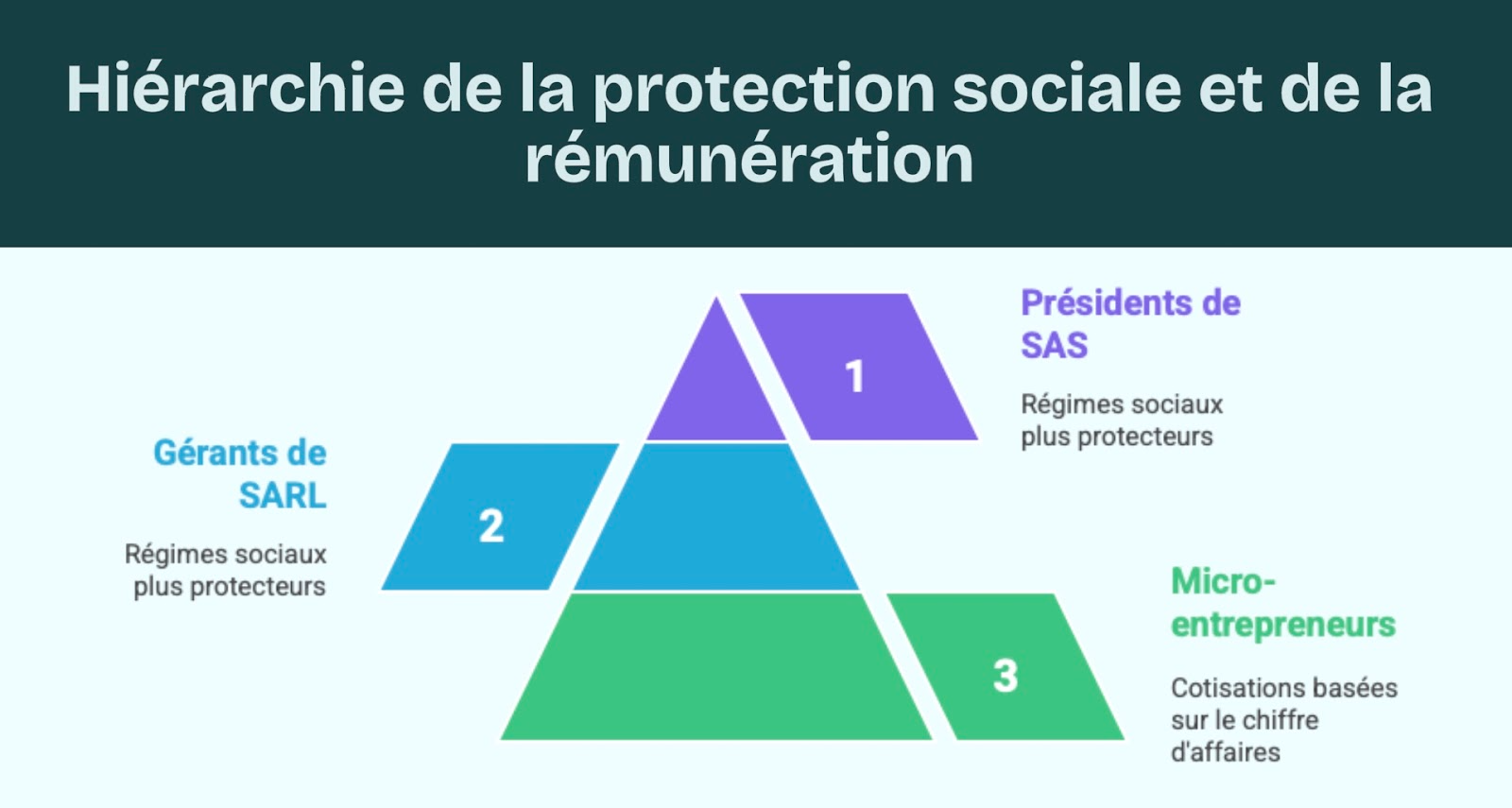 Les micro-entrepreneurs·ses cotisent sur leur chiffre d’affaires, alors que les gérant·e·s de SARL ou président·e·s de SAS ont des régimes sociaux différents et souvent plus protecteurs.