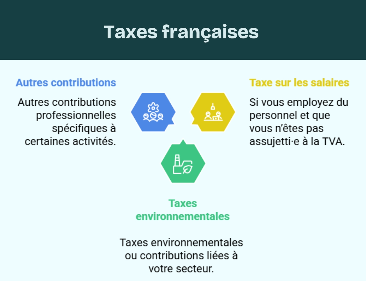- taxes environnementales ou contributions liées à votre secteur (transport, énergie, hôtellerie, publicité, etc.) ;